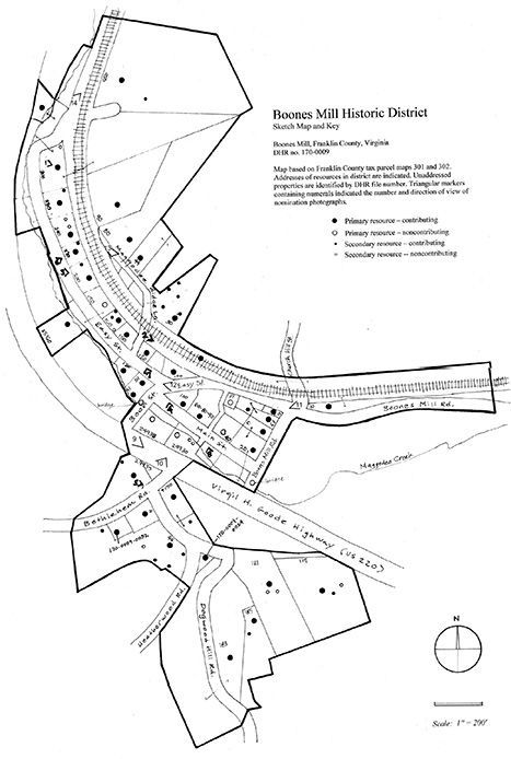 The Boones Mill Historic District encompasses the historic business district of the Town of Boones Mill, Franklin County, Virginia, and those contiguous residential areas that have a concentration of historic buildings. Located within the Blue Ridge Mountains, the topography includes steep ridges flanking a narrow, generally level valley through which Maggodee Creek flows. East of the creek, a railroad line winds through the district, following hillside contours. The commercial center and oldest developed residential areas are located on the flatter lands, while later residential areas typically occupy the steep hillsides. The District, approximately 45.3 acres in size, includes commercial development on Boon Street, Boones Mill Road, Easy Street, Main Street, Virgil H. Goode Highway (U.S. 220), and Bethlehem Road; and residential development along Dogwood Hill Road, Easy Street, and Maggodee Ridge Lane.